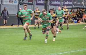 Still reduced to thirteen, the visitors’ forwards went through a few phases on the halfway line. With no number nine on the pitch, replacement Dorian Jones saw winger Ewan Bowden with space in front of him. Taking the ball Jones drew the winger and passed to Bowden just inside his half. Using his pace, Bowden sped up the line, chipped over the covering defender, chased his kick, collected the ball and dived over the try line to score an excellent individual try. Lloyd was unable to add the two points.