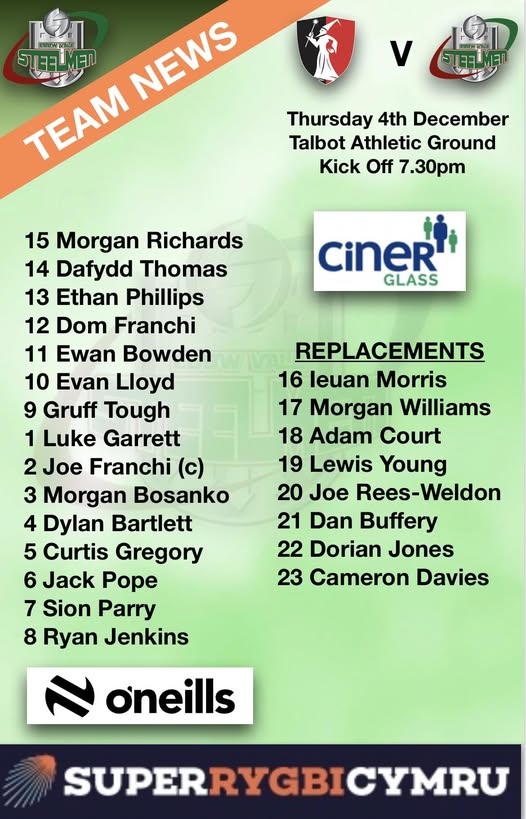 Ebbw Vale’s next game is at the Ciner glass community stadium against Bridgend RFC on Saturday 13th of December 2025, with kick off at 2:30pm.