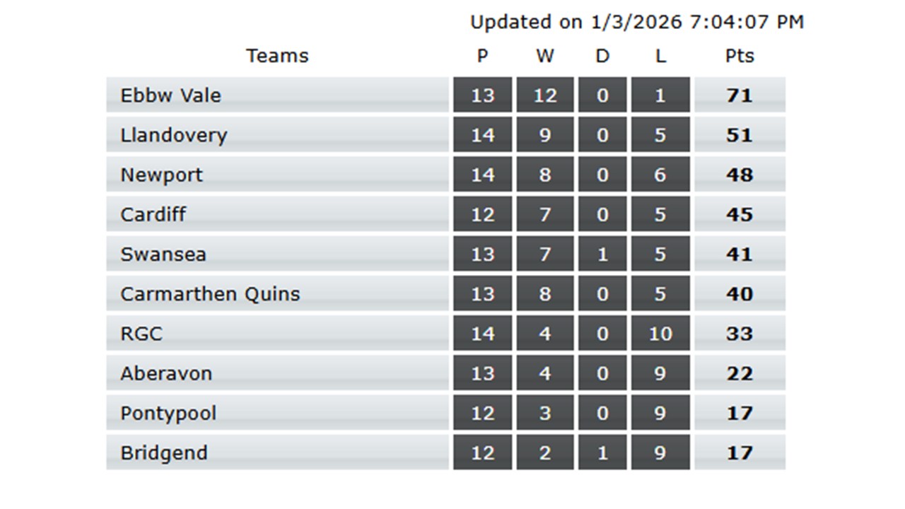 Table courtesy of All Wales Sport